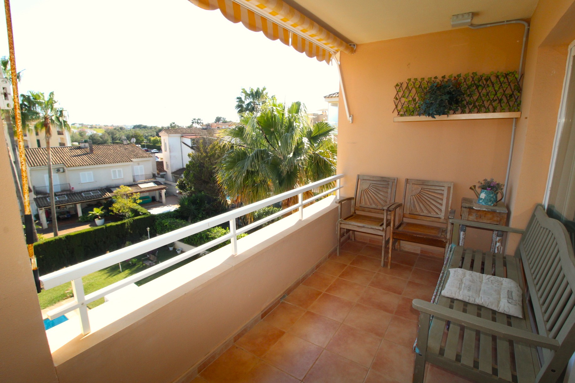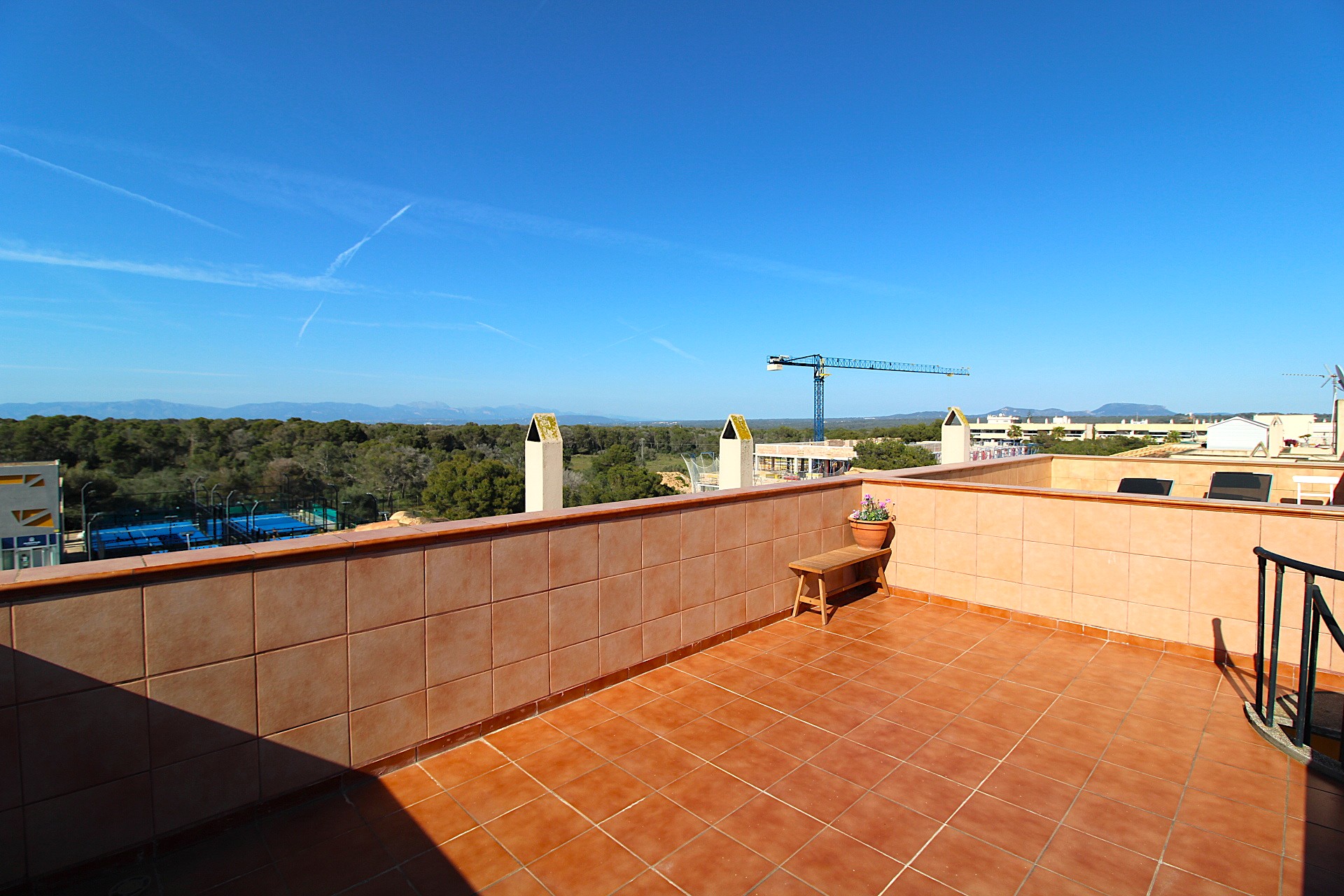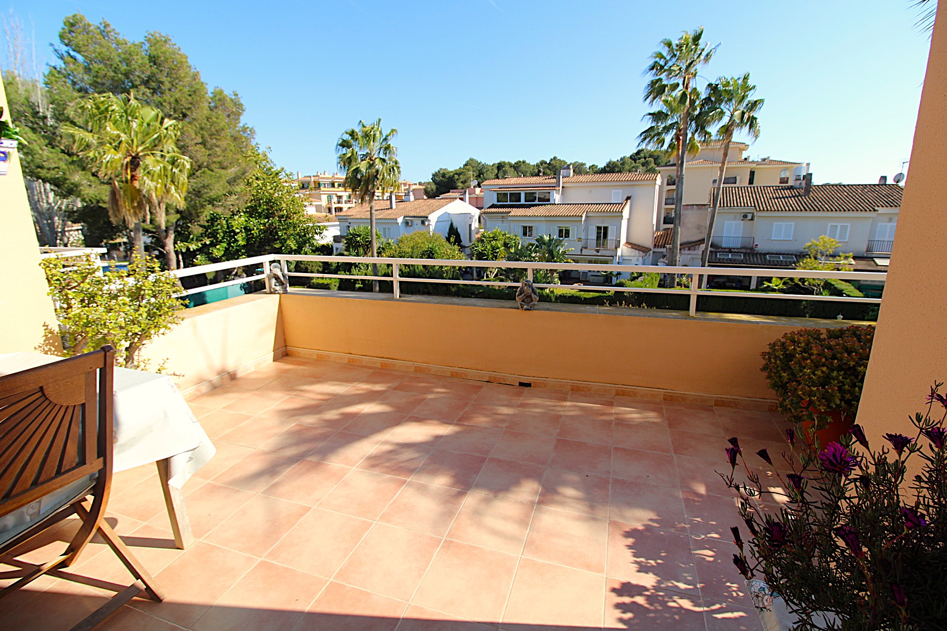 Fantastic duplex penthouse for sale in Maioris. It comprises a living-dining room, a fitted open-plan kitchen and a utility room, with access to a terrace overlooking the communal pool and garden. On the upper floor are two double bedrooms with fitted wardrobes, two bathrooms (one en suite), access to a terrace, and from there access to a sun terrace with superb unobstructed views. The property faces south and is very bright. It features parquet flooring, double glazing, pre-installation for air conditioning, a video intercom, etc. The building has a lift. Communal swimming pool and garden. A 10-minute walk from the sea.